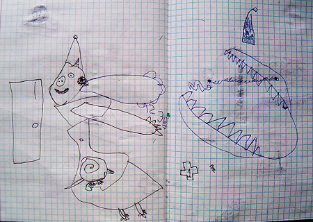 Осень 2011 - зима 2012 - Слева девочка, а справа внизу дракон, у которого есть ноги-крылья, а вверху корабль - ручкой в тетради